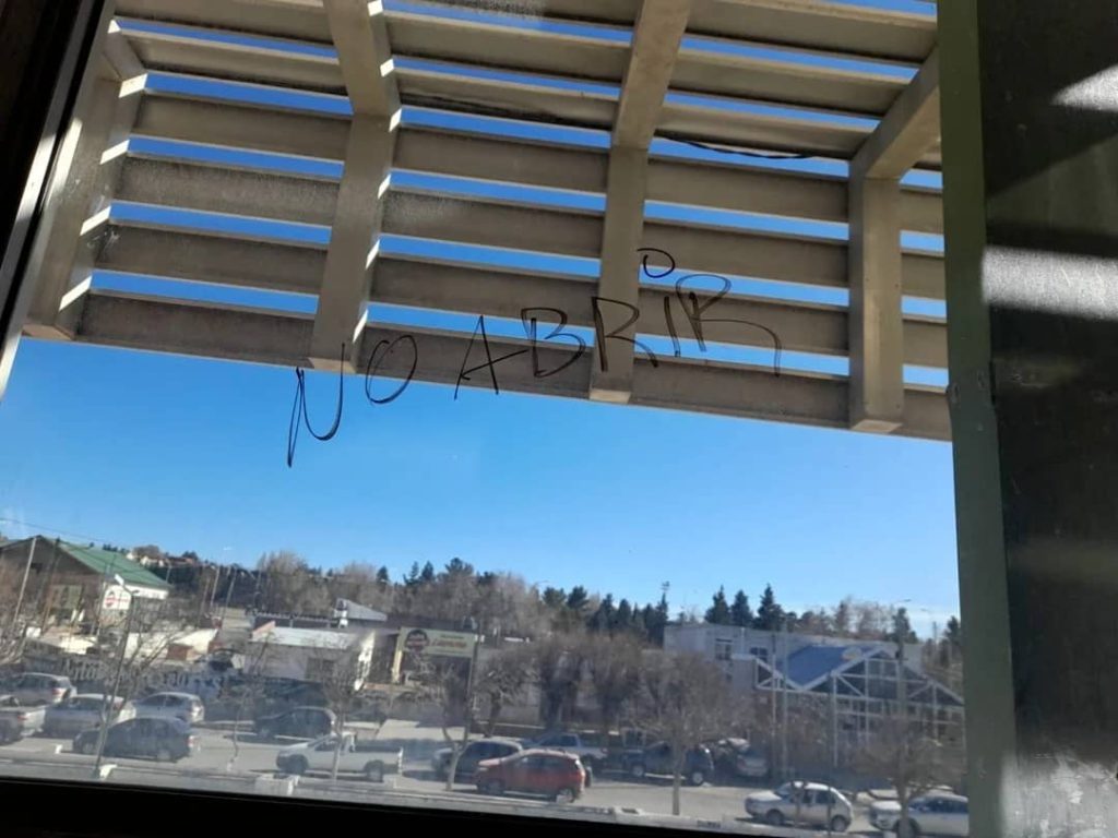 La única reparación a la vista fueron tornillos para “asegurar” las ventanas y la leyenda “no abrir” escrita con un marcador. Esta es la política del gobierno provincial para con nuestras escuelas. Con lo cual, la comunidad educativa tomó la decisión de suspender las clases hasta tanto no haya una solución integral.