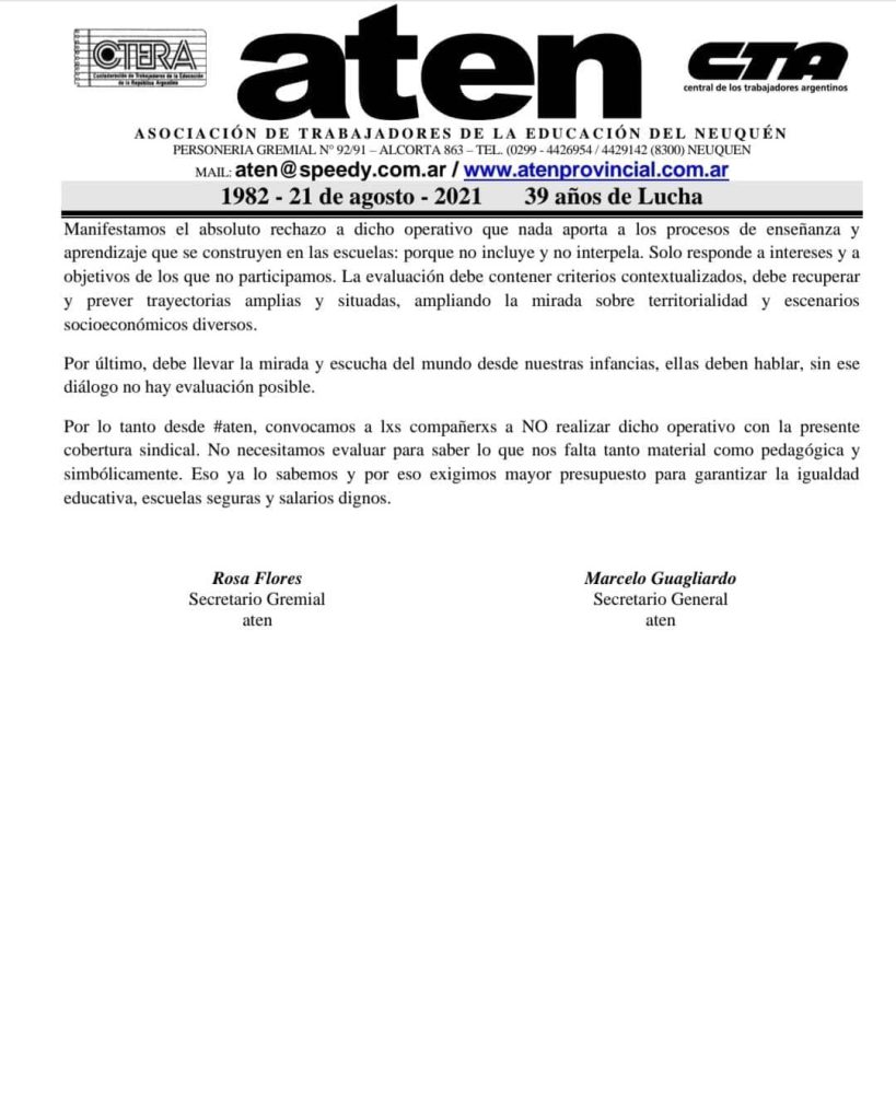 ⛔La misma consiste en la COBERTURA SINDICAL para la NO realización del Operativo de Evaluación «Aprender» convocado por el Gobierno Nacional y el Gobierno Provincial, para realizarse con estudiantes de Sexto Grado de las Escuelas Primarias.