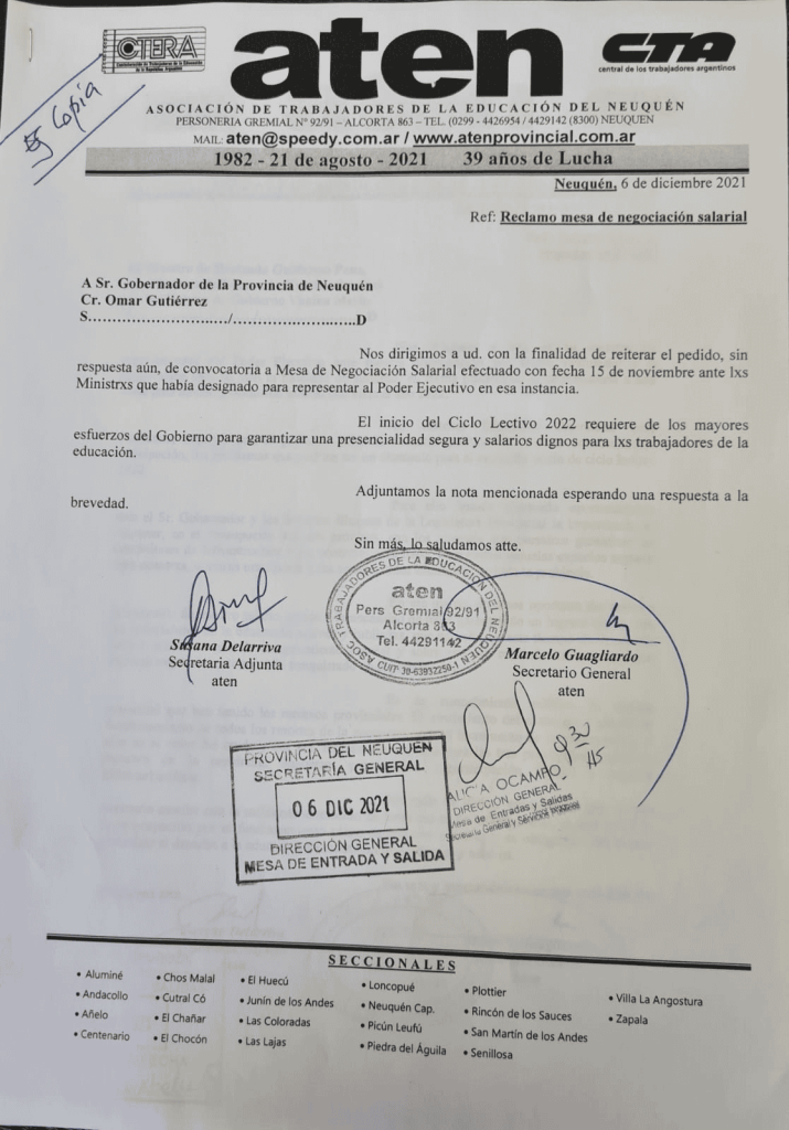 En el día de hoy, y luego de tres semanas sin respuestas, #aten REITERÓ al gobernador Omar Gutiérrez el pedido de MESA DE NEGOCIACIÓN SALARIAL.