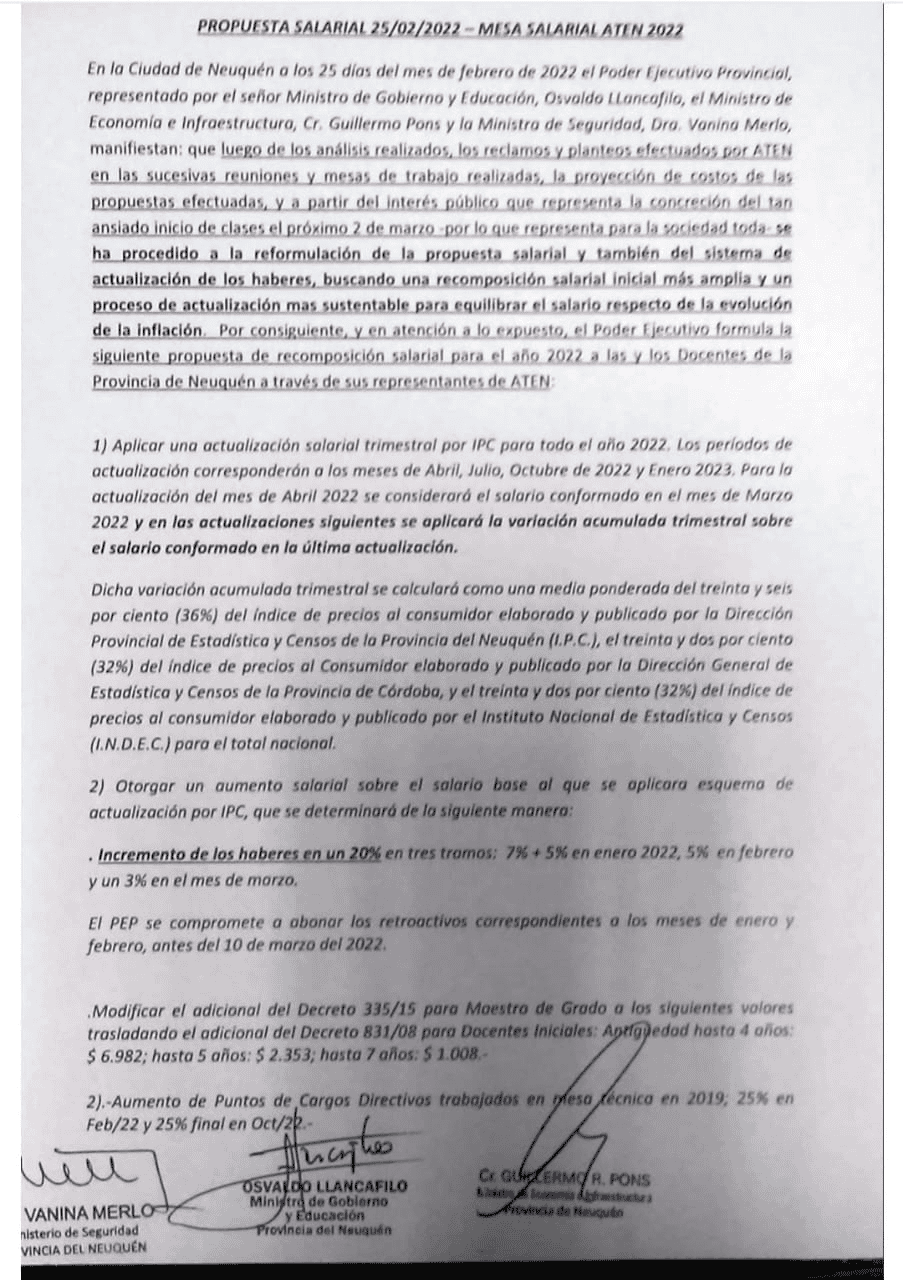 La propuesta para discutir en nuestras Asambleas tiene una mejora de un 20% sobre los salarios de enero, para a partir de allí aplicar clausula de actualización trimestral acumulativa que habían reclamado nuestras Asambleas.El cobro del retroactivo a enero y la diferencia del mes de febrero de 20 mil pesos promedio por cargo se cobra antes del 10 de marzo. A partir de marzo se fija un piso de $72.639.- MG sin zona sobre el q se va a calcular el IPC del primer trimestre.Se mantienen los otros puntos propuestos en la propuesta anterior.COMPARTIMOS ENLACE PARA ACCEDER A LAS GRILLAS ELABORADAS POR ATEN Y EL ACTA COMPLETA
