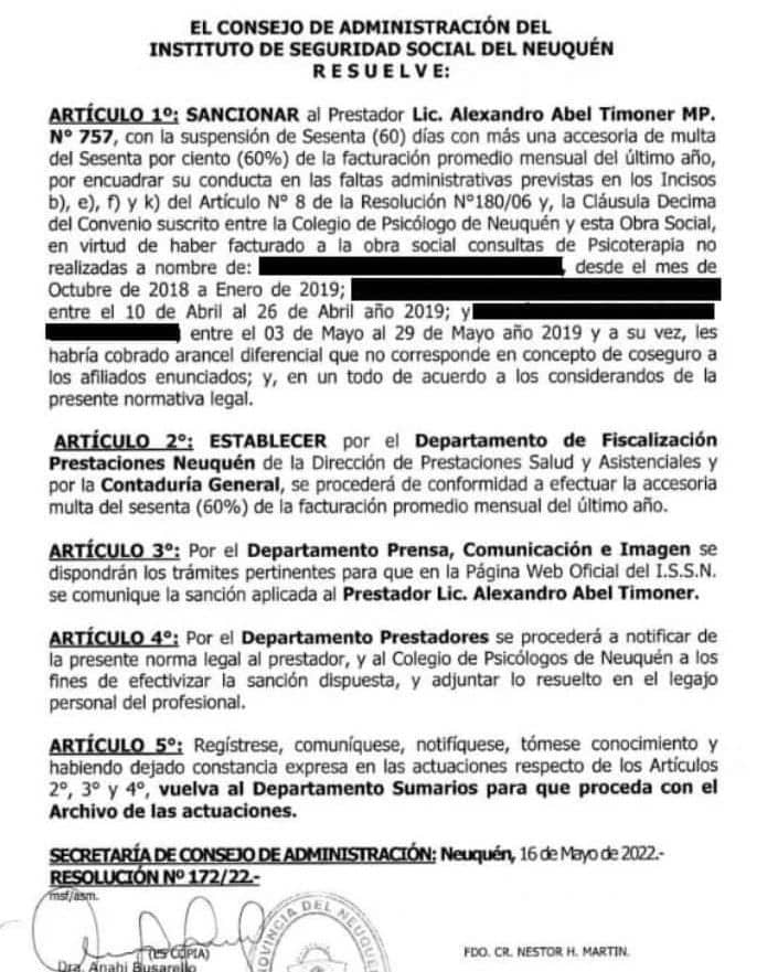Lxs consejerxs gremiales celebramos la SANCIÓN que el Consejo de Administración del Instituto de Seguridad Social del Neuquén (ISSN) le aplicó al profesional Alexandro Abel Timoner (M.P. 757), por facturar consultas no realizadas y por cobrar PLUS, lo que implica delitos contra la obra social y lxs afiliadxs denunciantes.