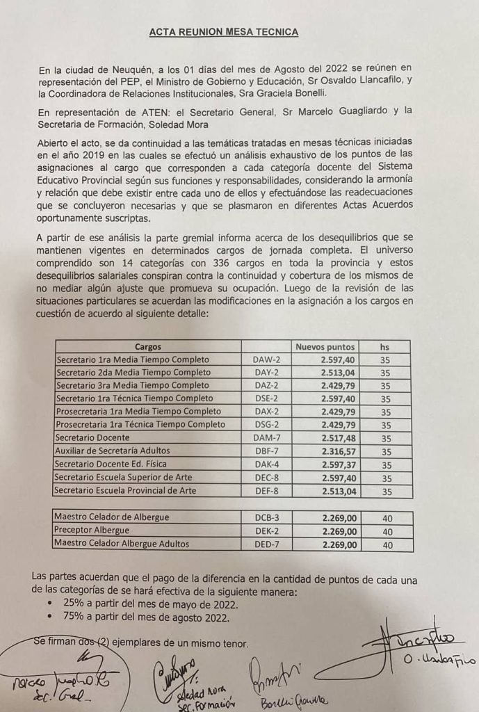 El pasado 1 de agosto se firmó el Acta en la cual se fijan nuevos puntos para los cargos de Secretaría Tiempo Completo Nivel Medio y Técnico, Superior, Adultos y CEF. Junto con ellos, cargos de Celadxr de Albergue Primaria y Preceptores Albergue Media y Adultos.