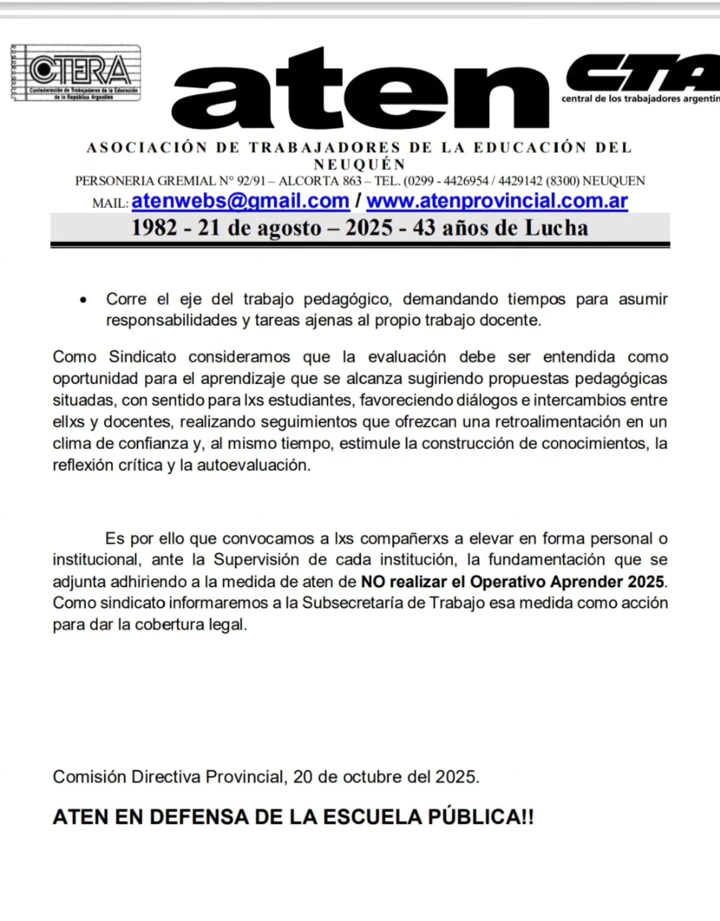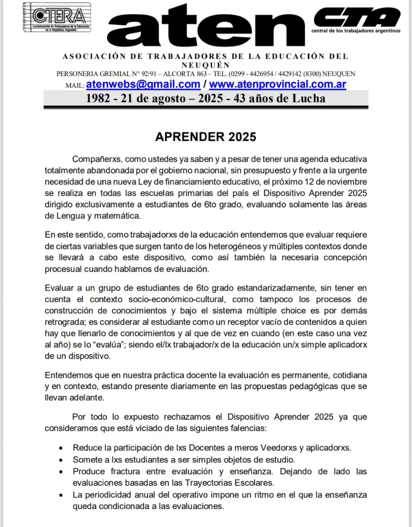 Convocamos a NO realizar el Operativo Aprender 2025.