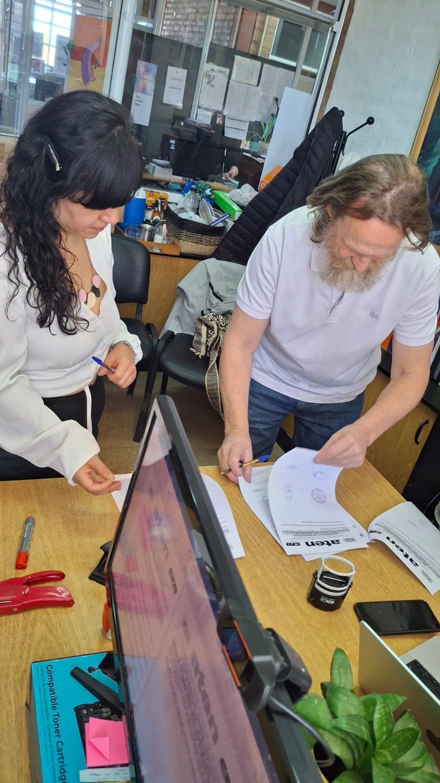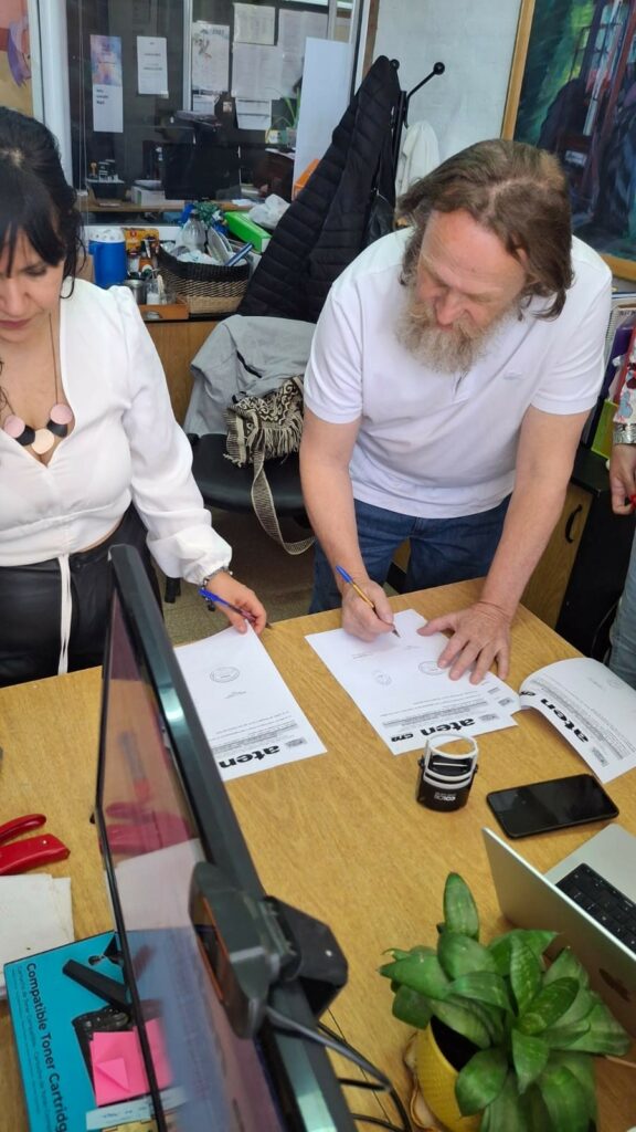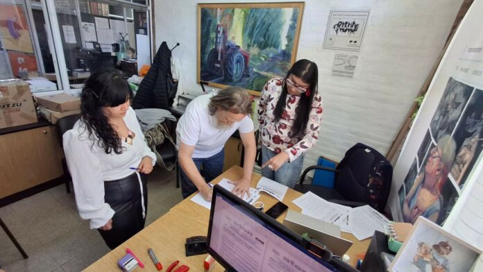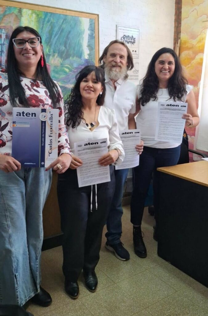 El acto contó con la presencia del compañero Marcelo Guagliardo, Secretario General de aten, la Rectora Prof. Romina Casco y la Secretaria de Extensión Prof. Ayelén Sepúlveda, en representación de la Escuela Superior de Bellas Artes y la compañera Chana Diaz, de la Escuela de Formación Carlos Fuentealba de aten.
