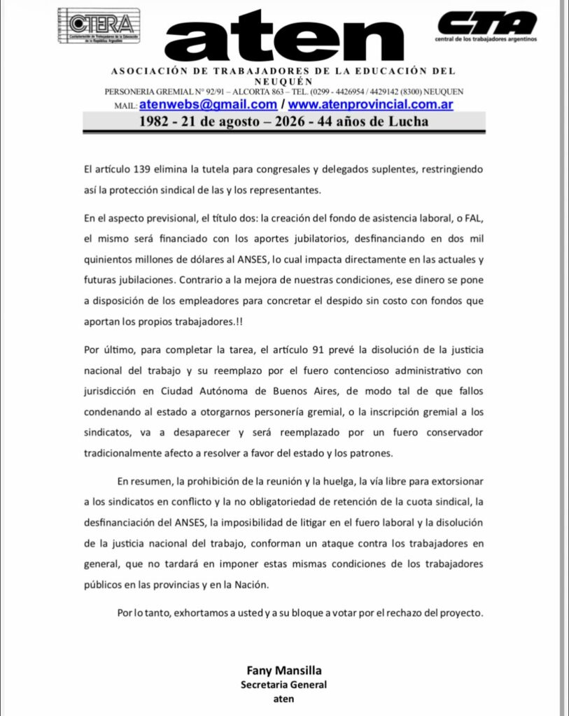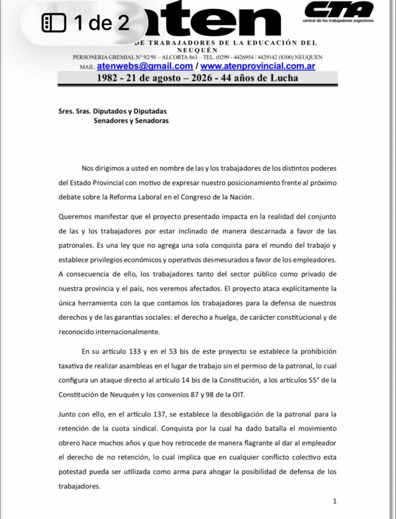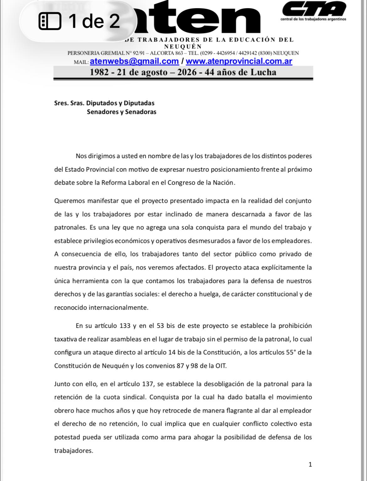 aten presentó ante los Diputadxs y Senadorxs que representan al pueblo de la provincia de Neuquén el posicionamiento en cuanto al proyecto de Reforma Laboral y el pedido firme que rechacen el mismo al momento de su tratamiento.