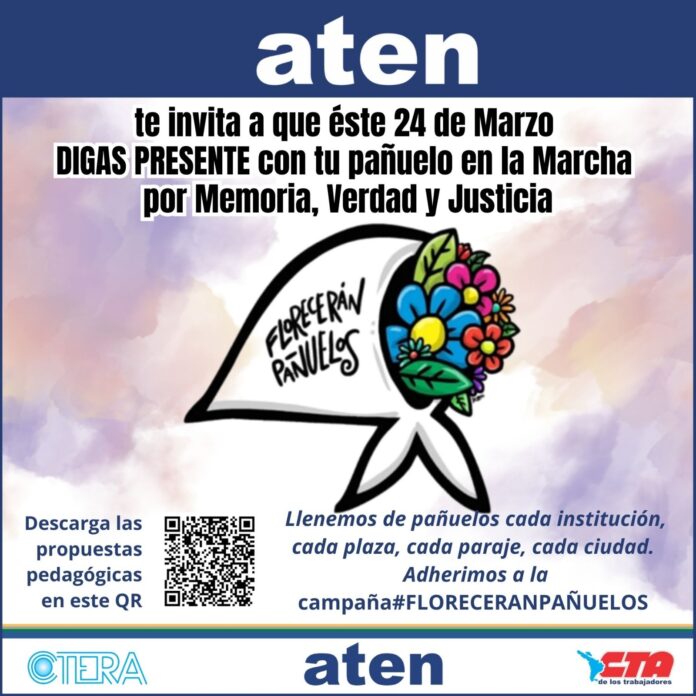 aten te convoca a DECIR PRESENTE con tu PAÑUELO en la Marcha por MEMORIA, VERDAD y JUSTICIA que realizan cada año Organismos de Derechos Humanos como Asociación Madres de Plaza Mayo filial Alto Valle y la Asamblea por los Derechos Humanos de Neuquén.