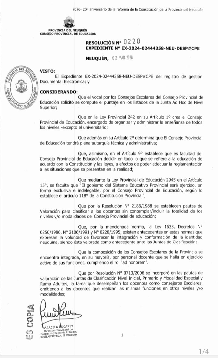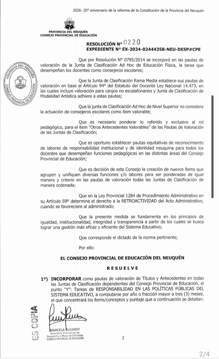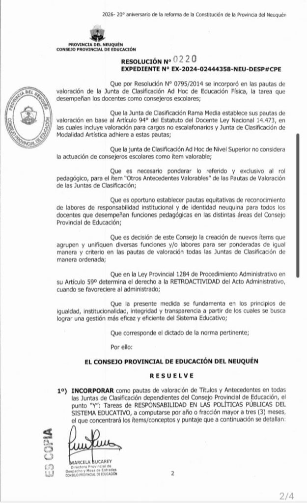 Como anticipamos, lxs representantes del Gobierno Provincial en el CPE se dieron puntaje, incluso retroactivo, en una acción absolutamente reprochable. Varios de los cargos mencionados en la Res N° 220/26 ya tienen un puntaje por el desempeño de dichas funciones; y no está mal que lxs Consejeros Escolares con cargo u horas en el Nivel Superior y Medio lo hayan reclamado, ya que era en los únicos niveles que no se lo valoraba, teniendo en cuenta además que el desempeño de dicho cargo es ad honorem, pero la resolución de este tema era resorte de la junta correspondiente y de fácil resolución.