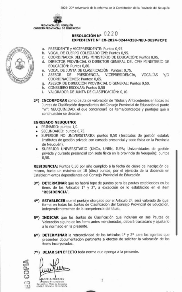 Enmascaran este bochorno con el reconocimiento de un puntaje a la «Neuquinidad», un reclamo quizás legítimo, aunque no queda claro si es justo y legal, de algunos crxs iniciales o se encuentran cursando carreras de Nivel Superior en la provincia. A ellxs, en la misma Resolución les aprueban un puntaje adicional al que otorga el Estatuto del Docente al Título Docente. Esto consiste en reconocer la certificación por haber cursado la Escuela Primaria, el Secundario y el Terciario y/o Universitario, sea este público o privado, en instituciones de la provincia.
