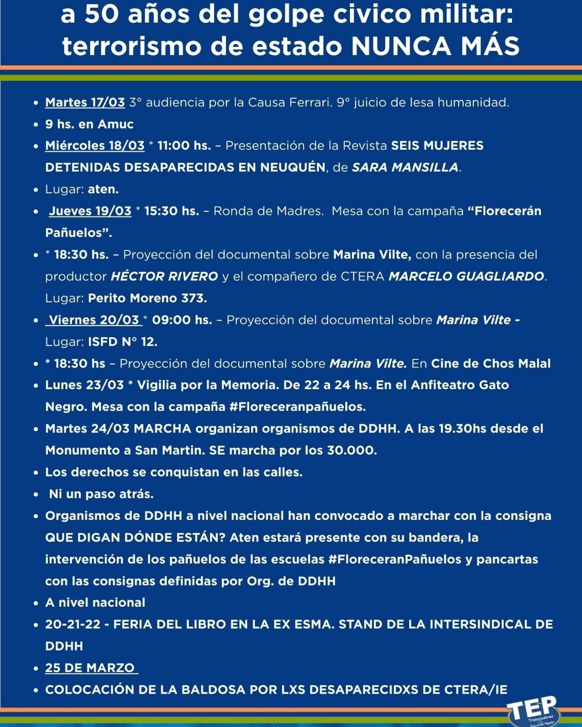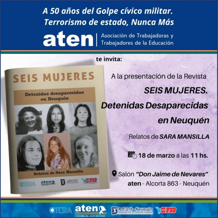 En el marco de los 50 años del golpe cívico militar, aten invita a la presentación de la Revista «SEIS MUJERES detenidas desaparecidas en Neuquén» Relatos de Sara Mansilla, que tendrá lugar el miércoles 18 de Marzo en Aten ( Alcorta 863).