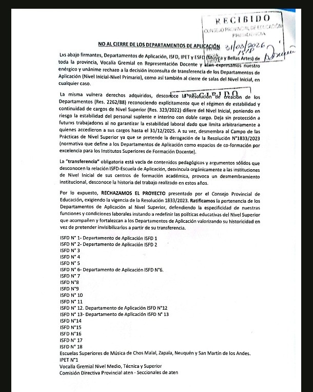 Compartimos el pronunciamiento unánime de todas las Instituciones de Nivel Superior de la Provincia en Defensa de los Departamentos de Aplicación, el mismo fue presentado por nuestrxs compañerxs Vocales en la sesión del Cuerpo Colegiado.