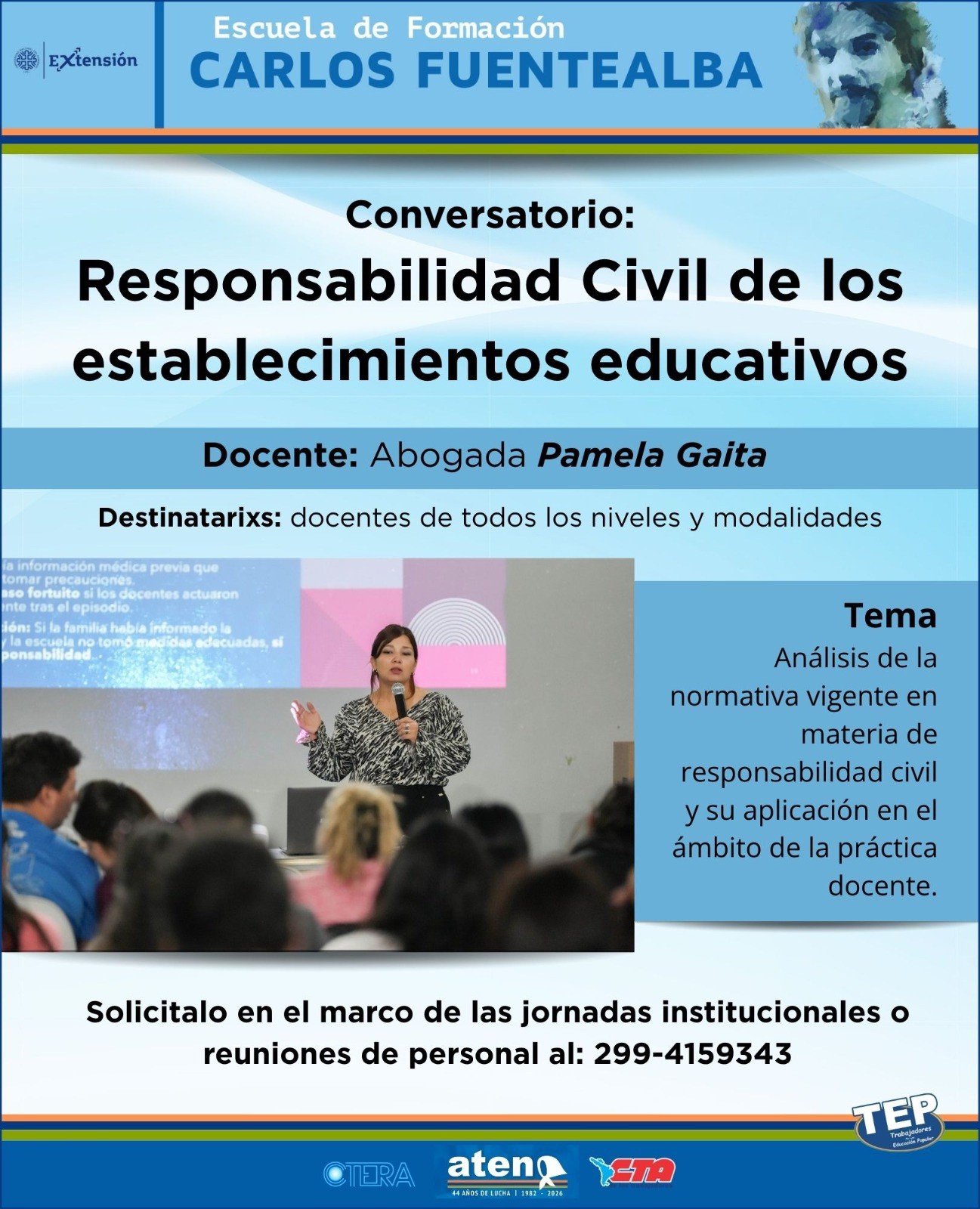 La Escuela de Formación Carlos Fuentealba lxs invita a un nuevo conversatorio a cargo de la Prof. Pamela Gaita sobre “Responsabilidad Civil de los establecimientos Educativos”.